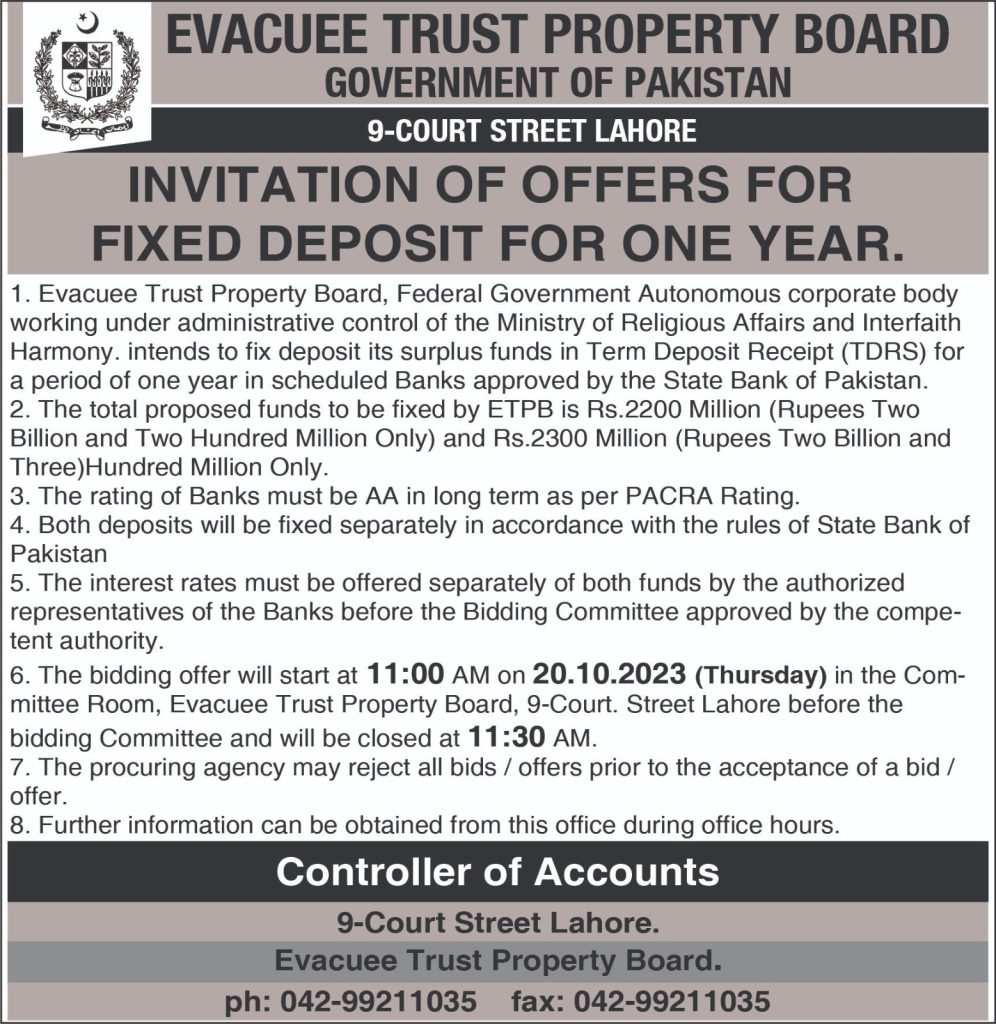 INVITATION OF OFFERS FOR FIXED DEPOSIT FOR ONE YEAR