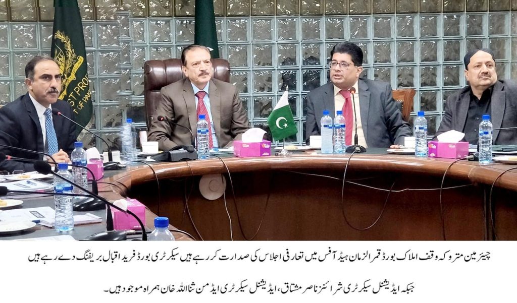 متروکہ وقف املاک بورڈ کے نو تعینات چیئرمین قمر الزمان نے باضابطہ طور پر اپنے عہدے کی ذمہ داریاں سنبھال لیں۔چیئرمین بورڈ کی زیر صدارت ہیڈ آفس 9 کورٹ سٹریٹ میں تمام برانچ سربراہان کے ساتھ ایک تعارفی اجلاس منعقد ہوا، جس میں چیئرمین کو بورڈ کے مختلف شعبہ جات کی کارکردگی، انتظامی امور اور جاری منصوبوں پر سیکرٹری بورڈ فرید اقبال نے تفصیلی بریفنگ دی گئی۔ اجلاس میں ایڈیشنل سیکرٹری شرائنز ناصر مشتاق ،ایڈیشنل سیکرٹری ایڈمن ثنا اللہ خان اور تمام برانچز کے سربراہان نے شرکت کی۔ چیئرمین بورڈ کو املاک، شرائنز، فنانس، ایچ آر، لیگل اور ایڈمنسٹریشن سمیت شعبہ جات کی کارکردگی، درپیش چیلنجز اور مستقبل کے اہداف سے آگاہ کیا۔